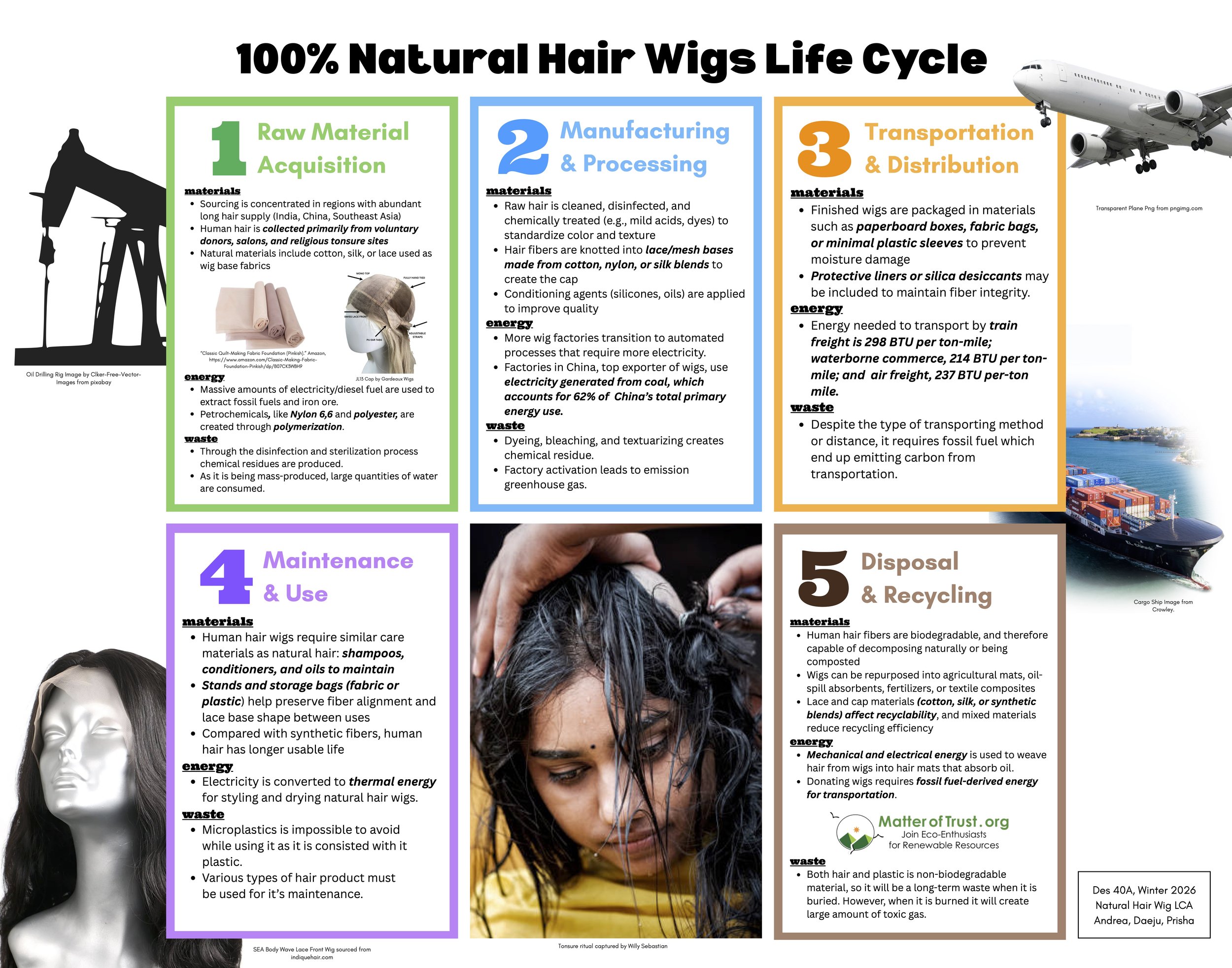 The final stage of disposal and recycling is often overlooked, as specific data on wig disposal is scarce. It is likely that most wigs end up in landfills if they are not recycled or donated. However, optimistic paths towards creating a more circular life cycle for this industry are out there. Eco-friendly organizations, such as Matter of Trust, have developed programs to repurpose human hair by creating hair mats used to clean up oil spills. Wigs are taken apart, then mechanical and electrical energy can be used to weave hair from wigs into hair mats that absorb oil, as seen in videos by Matter of Trust. Also, a quick online search will reveal the many organizations that accept wig donations to give to those with medical conditions that cause hair loss. The energy required for this, however, comes from fossil fuels, as the wigs need to be transported. As for the synthetic plastics in wig caps, these petrochemicals can be repurposed again using the feedstock energy stored in synthetic materials (Hamman).