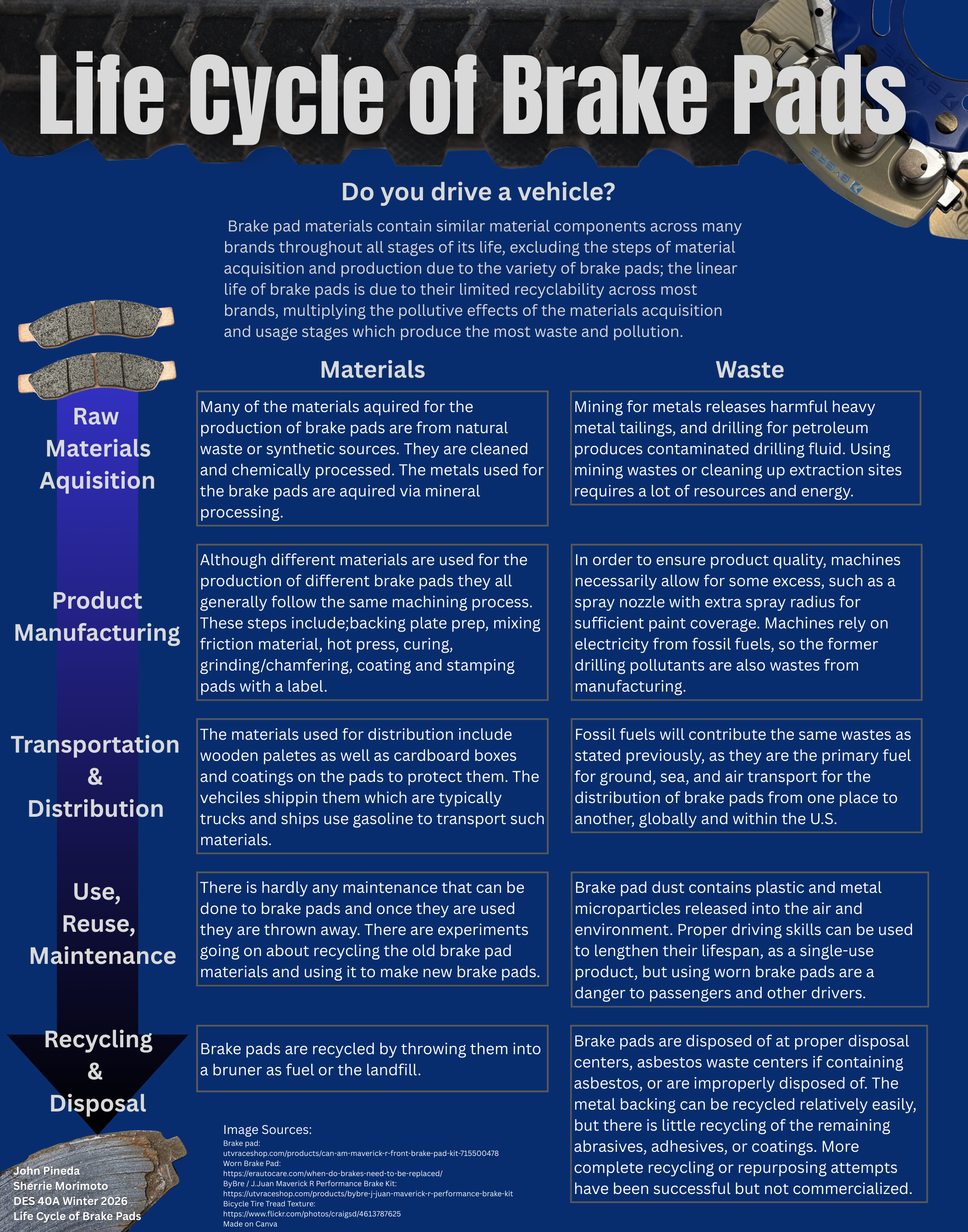 From the automobile boom of the twentieth century to the development of alternative fuel cars, it is evident that the United States has grown reliant on cars as an accessible mode of transportation, with 91.7% of households owning cars in 2022 (Valentine 2026). Regardless of whether the vehicle is a sedan, SUV, or truck, one of the many parts that are always present and necessary are the brake systems. Braking systems are a crucial part of safe transportation, with antilock braking systems from the 1960’s and brake disc innovations contributing to the improved efficiency and control of the vehicle. In particular, the brake pad has seen lots of development through the variety of brake pads, which grow with increasing research and development into new materials or to accommodate new car models and strengths. The basic function of the brake pad is to provide a replaceable yet durable source of friction which converts the kinetic energy of the rotating wheel into thermal energy, or heat (Borawski 2020). As a crucial part of all vehicles, and consequently the lives of those who are influenced by their vehicles, it is imperative to analyze the sustainability of brake pad production by conducting a Life-Cycle Analysis (LCA) of the brake pad. An LCA covers the five stages of raw material acquisition, product manufacturing, product distribution, product use and maintenance, and product recycling and disposal in order to dissect the individual components of materials used, energy consumed and waste produced in each stage. The main topic to be discussed will be research into the types of waste produced within the life cycle of brake pads, followed by their anthropocentric and environmental effects. Brake pads produce pollution in both stages of acquiring raw materials and their use in vehicles, producing mining tailings and toxic microparticles respectively; the net environmental impact, however, should also be evaluated by accounting for the lack of an established recycling stage which necessarily perpetuates the former stages of manufacturing, thus multiplying the negative environmental impact.