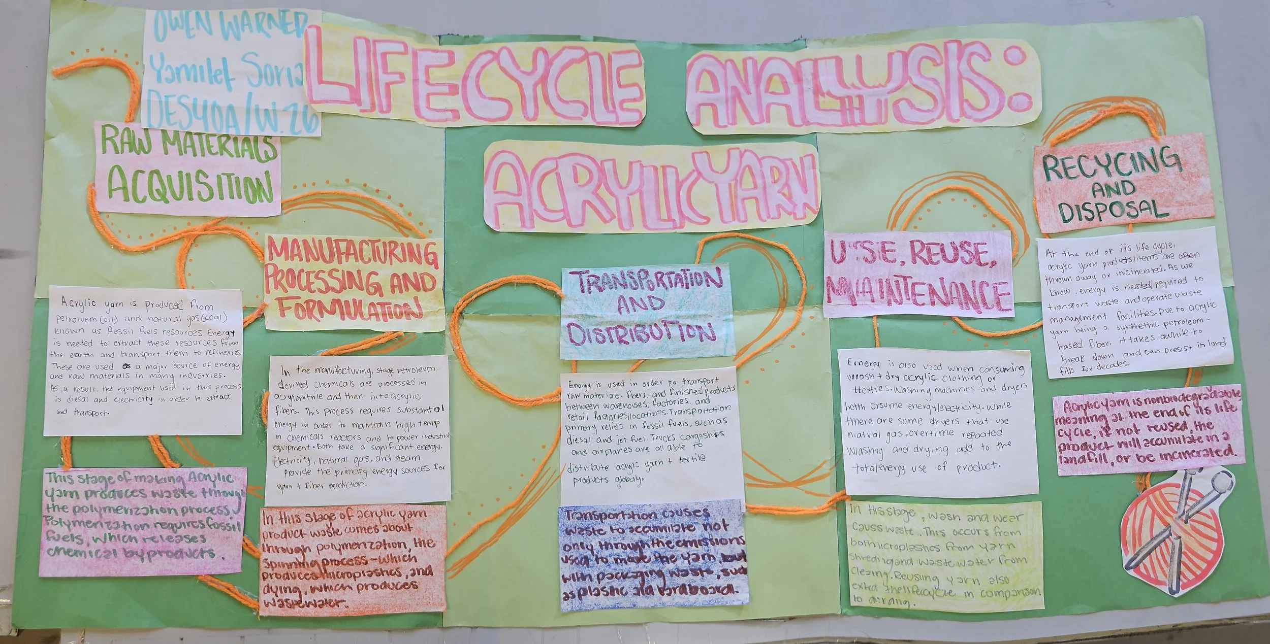 Gaining an understanding behind the the complete “cradle-to-gate” life cycle that creates a product, such discussed thoroughly throughout this paper with the example of the synthetic, acrylic-based yarn, can be useful to hold space and fully grasp the complete context and what it takes for something to reach the end goal of the consumer use stage. The full story of this textile involves the production of waste through multiple different stages of development, such as discussed with chemical processing, high energy consumption, and microplastic release. While viewing a product through this lens might fill one with a sense of nihilism or dread because of the negatives, it is important to not stop here, but continue to adopt methods, such as reusing discarded materials or reintroducing worn garments back into the consumer market, to hopefully lessen the burden seen!