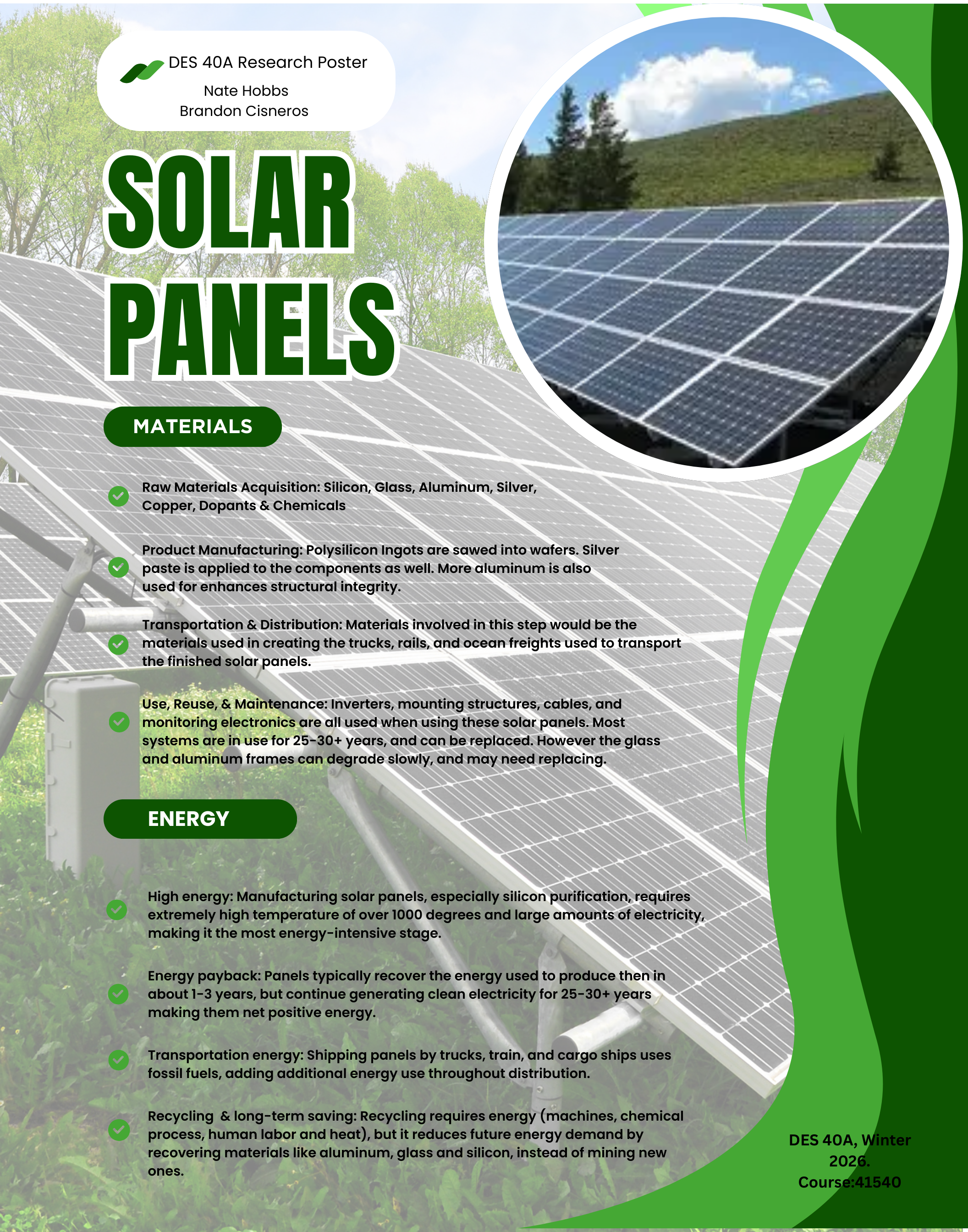Despite the high energy cost involved in earlier stages of the production, solar panels provide significant environmental benefits during their use phase. Once installed, solar panels provide clean electricity for homes, businesses, and the power grid without relying on fossil fuels. Solar panels typically operate for approximately twenty five to thirty years. During this time, they generate far more electricity than the amount of energy required to manufacture them. This concept is known as energy payback time. Energy payback time refers to the amount of time required for a solar panel to generate the same amount of energy that was used during its production. Studies show that photovoltaic systems generally recover their energy investment relatively quickly. According to Muteri, solar panels “typically recover the energy used during their production within a few years of operation” (Muteri et al.). After reaching this point, solar panels continue generating renewable energy for the remainder of their lifespan. Maintenance during the use phase requires relatively little energy compared to earlier stages. Solar panels may occasionally need cleaning or minor repairs, but these activities require minimal additional energy. As a result the use phase represents the most environmentally beneficial stage of its life cycle.
