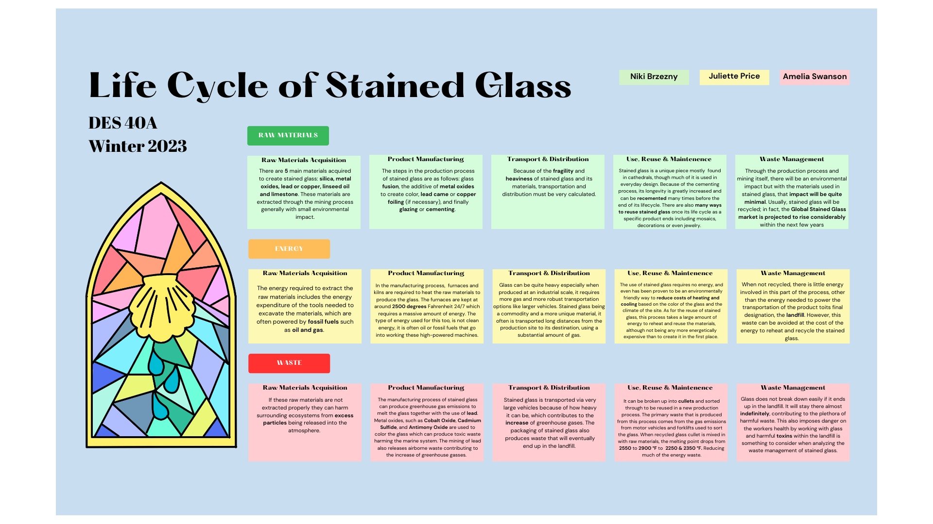Stained glass has become a staple in many architectural structures and makings, but while it adds a touch of beauty in these scenes, architects, producers, and consumers should know how sustainable it is in our environment. After observing the life cycle of a piece of stained glass, it is important to understand the logistics behind the primary materials utilized in manufacture, how they were mined or produced and the process each goes through to complete the entire life cycle of a stained glass panel. It is understood that the materials of stained glass including silica/sand and other primary materials are generally environmentally sustainable but as a piece of glass undergoes its transformation into stained glass (a secondary material)through the addition of impurities and glazing, the level of sustainability slowly decreases. While this is true, stained glass can still be a suitable material for recycling because glass can easily be broken down and reshaped into new materials and has provided a unique touch in the world of architecture.
