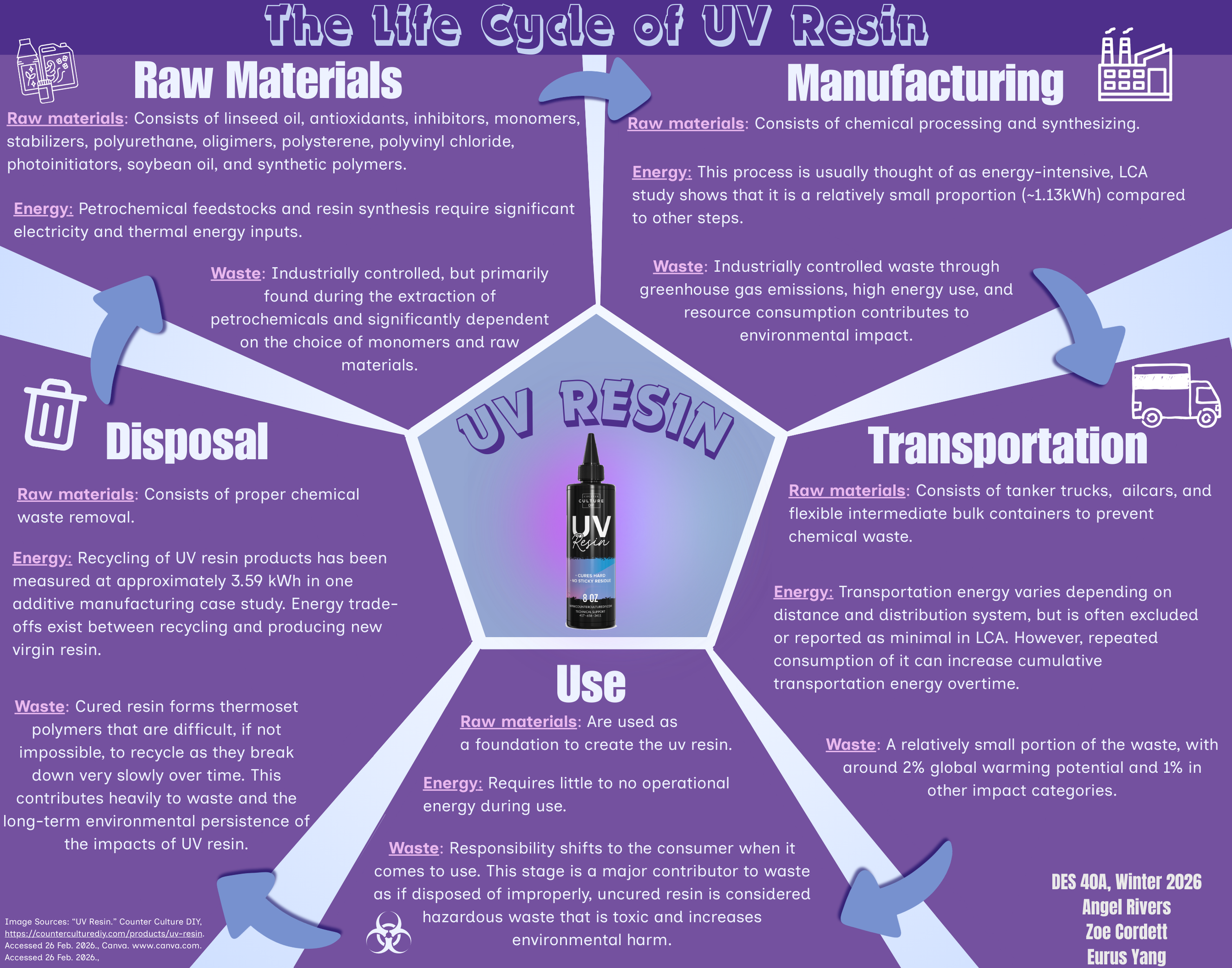 UV resin is a durable and glossy material often used for crafting, hobbies, 3D printing, coating, and repairing, which makes it perfect for casual uses as well as industrial applications. It is especially appealing compared to traditional two-part resins as it is a one-part resin and quick-curing when exposed to UV light. While these characteristics may make it appealing for a variety of applications, the life cycle of such a product is an extensive process, consisting of numerous steps that ultimately result in waste implications often disregarded. Thus, with an increasing number of people looking to use such a versatile tool, there comes an increasing risk of users not fully aware of the environmental consequences that come with its production and potentially improper disposal. This waste is an important environmental consideration that plays a role in deciding on what type of resin to use for a project. The Life Cycle Assessment is a comprehensive process that evaluates all of the raw materials, energy, and waste that is included in every stage of an object from the beginning to the end. Considering the entire life cycle of UV resin, each stage results in waste being produced with the most significant amounts of waste occurring during the use and disposal stages, as uncured resin leads to hazardous waste and cured resin forms thermoset polymers that result in long-term environmental persistence.