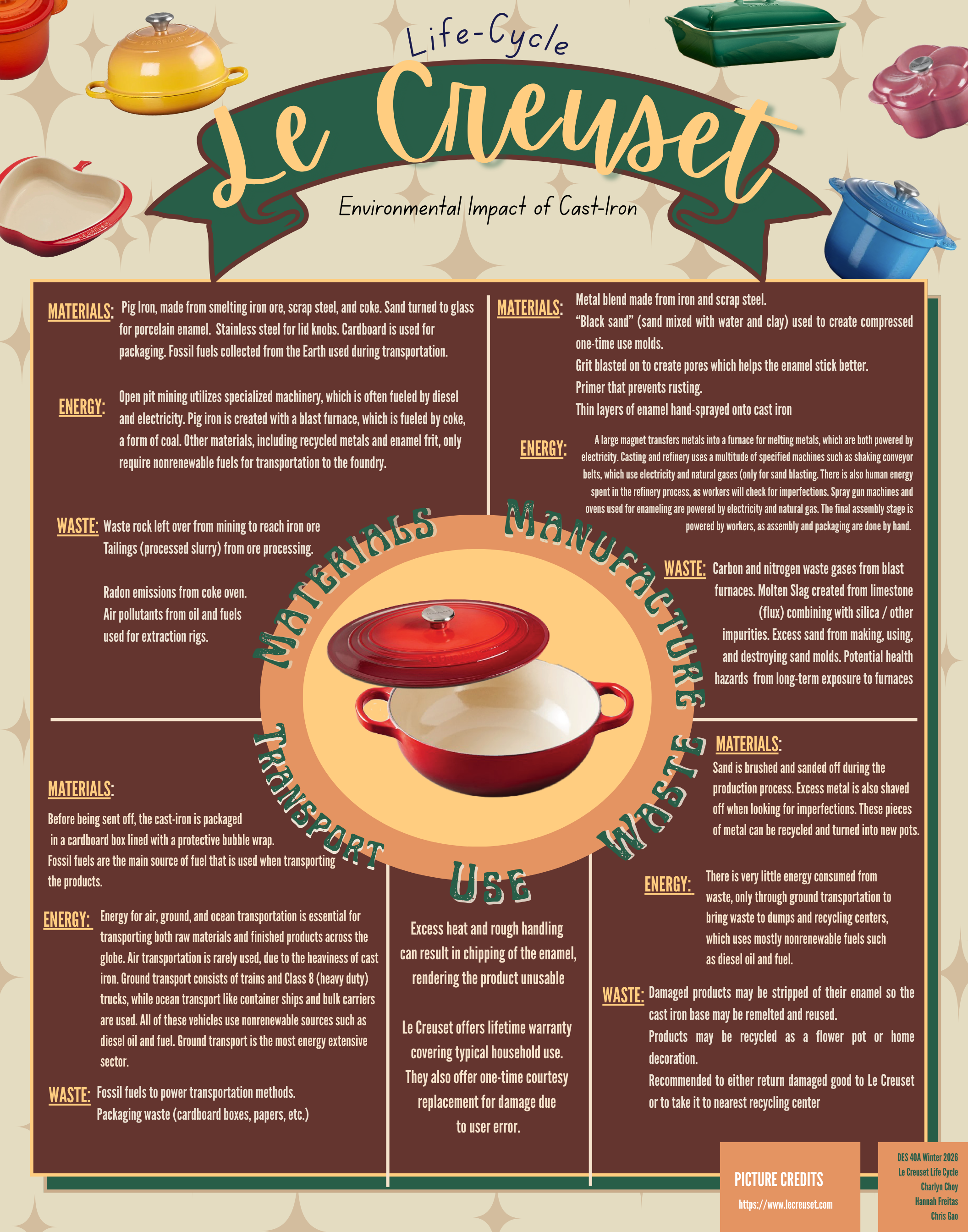 From its humble beginnings in 1925, the French cookware brand Le Creuset has since grown into a globally recognized household staple. Their products are well known for being high-quality while also being aesthetically pleasing. The brand is best known for producing cast iron products that have rich, vibrant colors that also act as protective enamel. These products are exclusively manufactured in Le Creuset’s foundry in Fresnoy-Le-Grande, France to ensure every single product stands the test of time. Many of the processes and materials that make Le Creuset cast iron produce physical wastes and air pollutants that pose potential health hazards for humans and the environment alike. To capture the environmental impact of Le Creuset cast iron, this paper will examine wastes produced in each phase of lifecycle analysis, from raw materials to disposal, and potential outside factors that increase the company’s waste footprint.