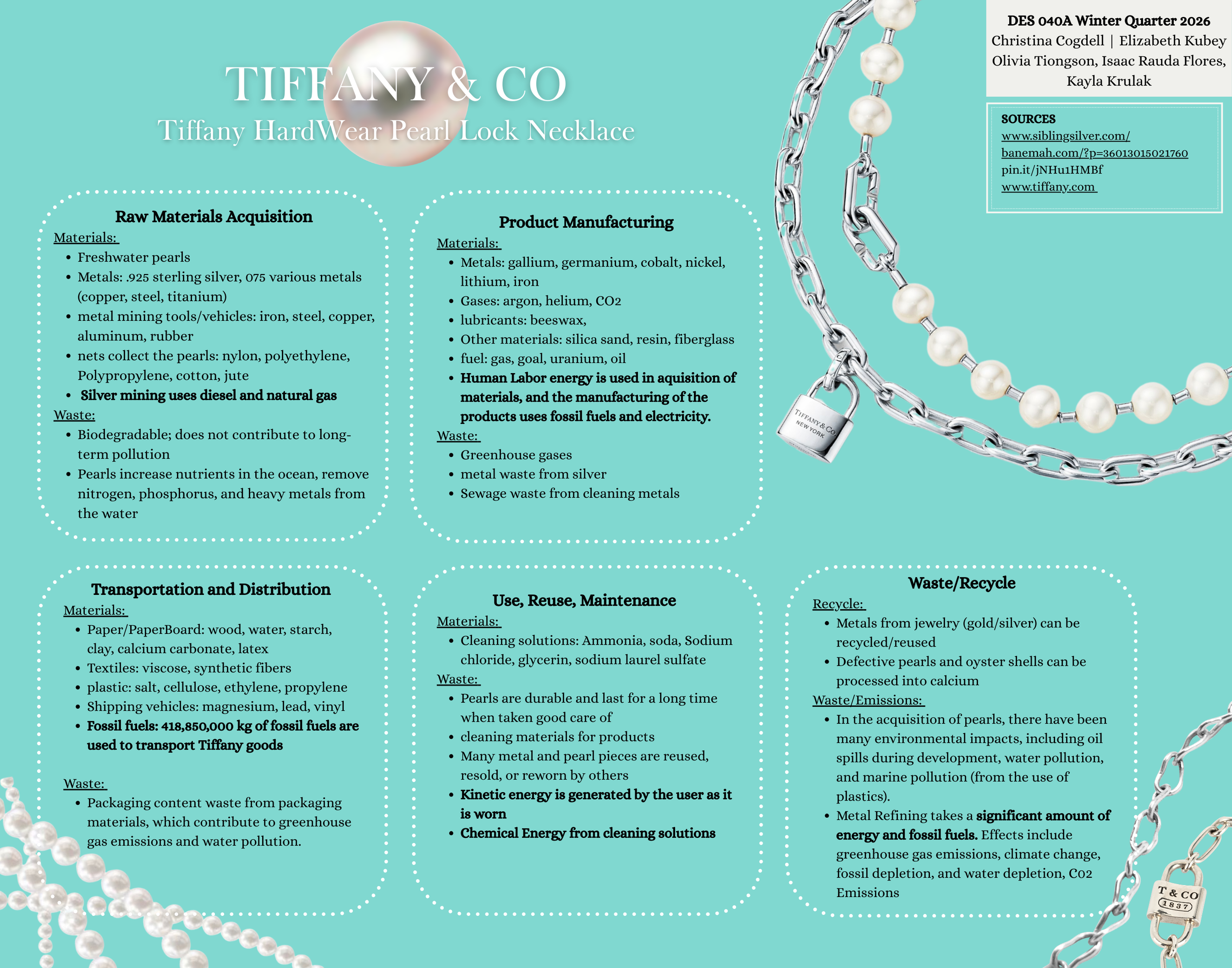 Tiffany & Co. is a jewelry company known for its extravagant luxury pieces. Their jewelry ranges from a variety of materials, but mostly silver, pearls, and diamonds. In the manufacturing of their products, they have vastly impacted the environment. This paper will analyze the waste produced in the life cycle of the Tiffany HardWear: Pearl Lock Necklace in Silver, most importantly, the product manufacturing, raw materials acquisition and use, reuse, and maintenance stages. Along with how the jewelry industry contributes to the significant environmental and social impacts of water pollution, greenhouse gas emissions, and discussing the changes it makes as it strives towards sustainability.