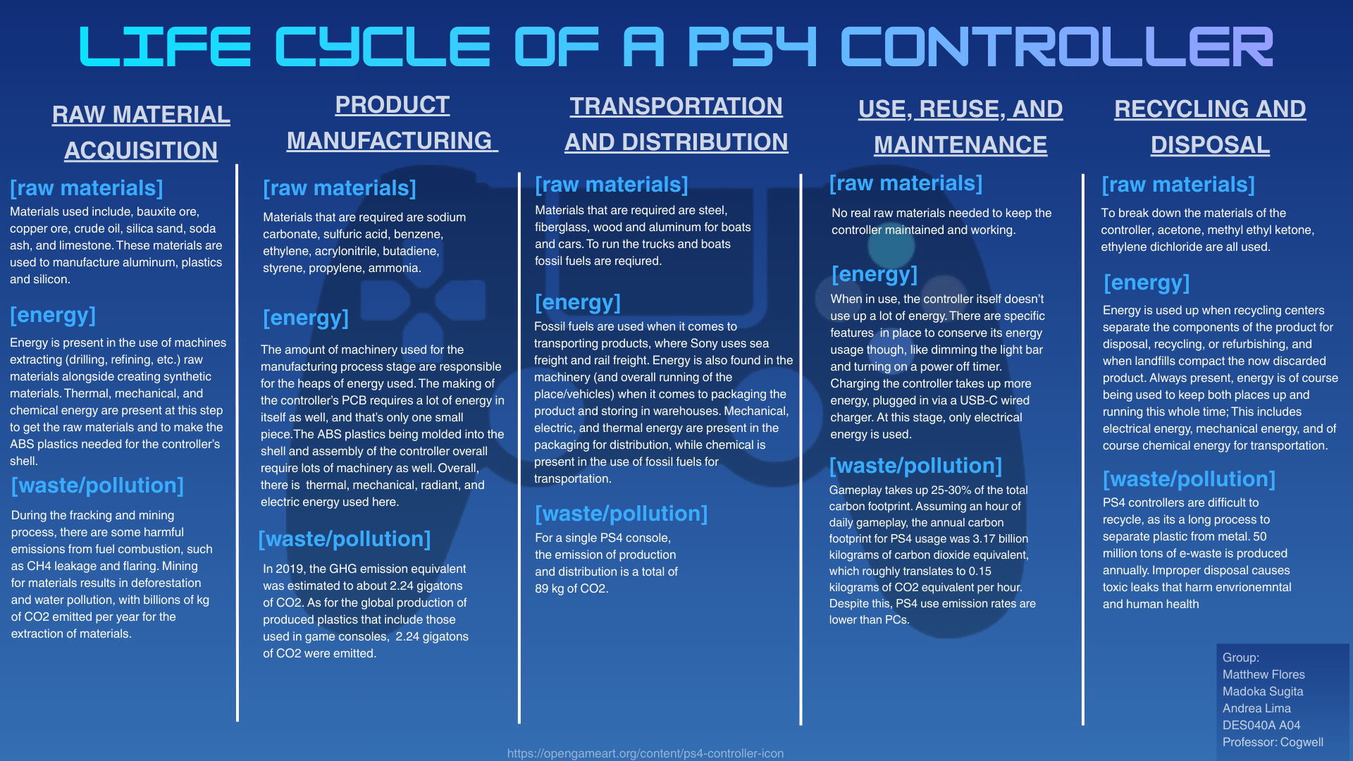 In this paper I have covered the waste produced during all stages of the life cycle of the PS4 controller, ranging from the acquisition of raw materials and the recycling and disposal of it. Due to its popularity and demand, PS4 consoles and controllers require an abundance of production and distribution, which contributes significantly to GHG emissions – from extraction of materials, production, distribution, and usage. It produces staggering amounts of waste throughout its entire life cycle, and its total carbon footprint, as well as its environmental damages – call for the importance of being mindful of the power consumption and emissions, as well as better ways of management of broken/nonreusable console parts.
